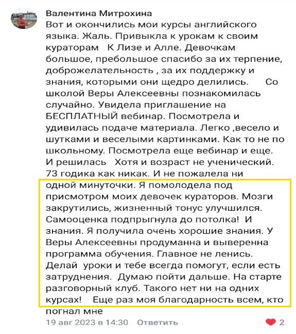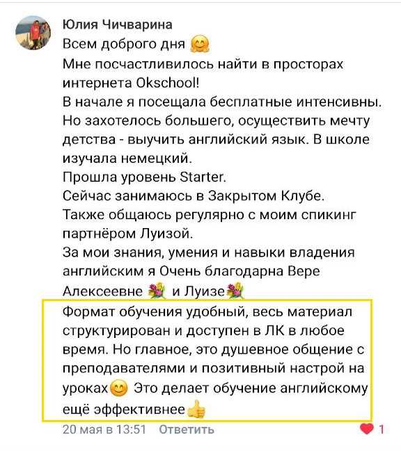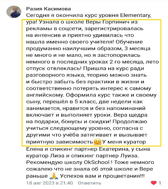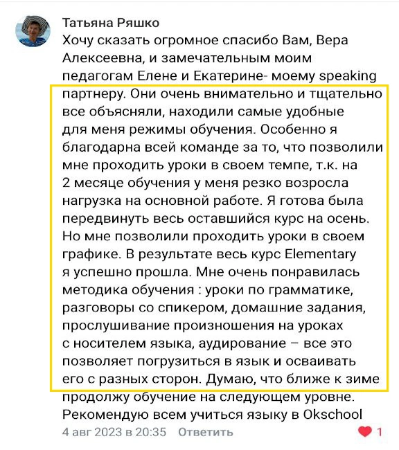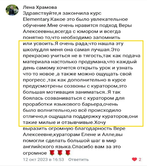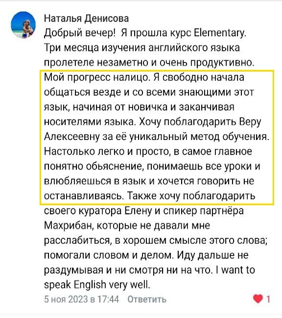 Для меня важно, чтобы ученик от моего курса получил максимальный результат — заговорил на английском без страха! Я наблюдаю каждый день стремительный прогресс своих учеников благодаря комплексному подходу к обучению и ежедневным небольшим и приятным занятиям.